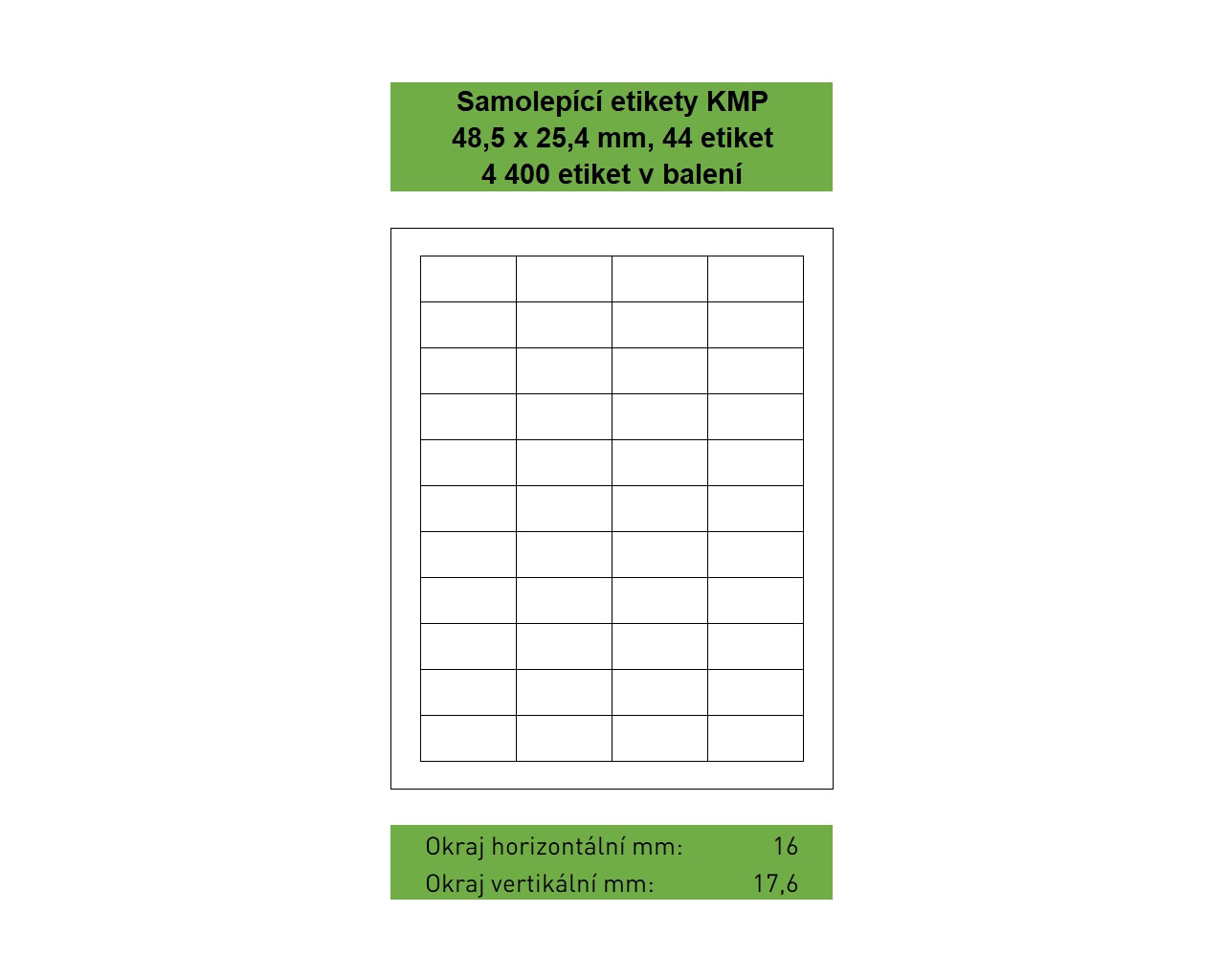 Samolepící etikety KMP velikosti 48,5 x 25,4 mm, 44 etiket na listu, 100 listů A4 v balení, 4 400 etiket. Svrchní bílý bezdřevý matný papír klasické gramáže 70g/m². Spodní strana permanentní akrylátové lepidlo. Etikety jsou na podkladovém papíru o gramáži 55 g/m². Etikety jsou určeny pro potisk ve všech běžných typech laserových a inkoustových tiskáren.