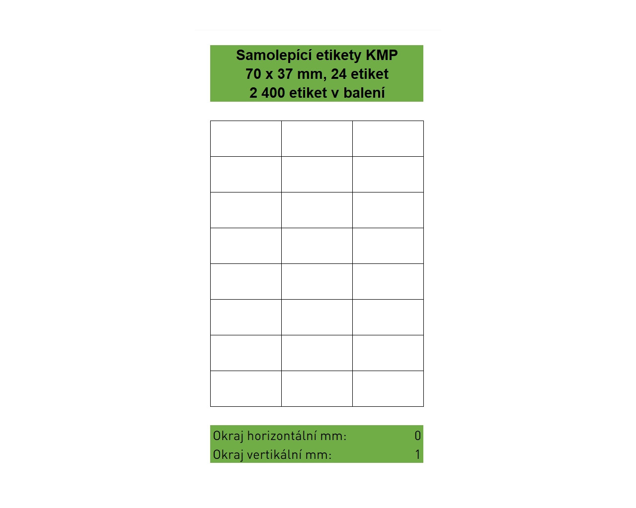 Samolepící etikety KMP velikosti 70 x 37 mm, 24 etiket na listu, 100 listů A4 v balení, 2 400 etiket. Svrchní bílý bezdřevý matný papír klasické gramáže 70g/m². Spodní strana permanentní akrylátové lepidlo. Etikety jsou na podkladovém papíru o gramáži 55 g/m². Etikety jsou určeny pro potisk ve všech běžných typech laserových a inkoustových tiskáren.