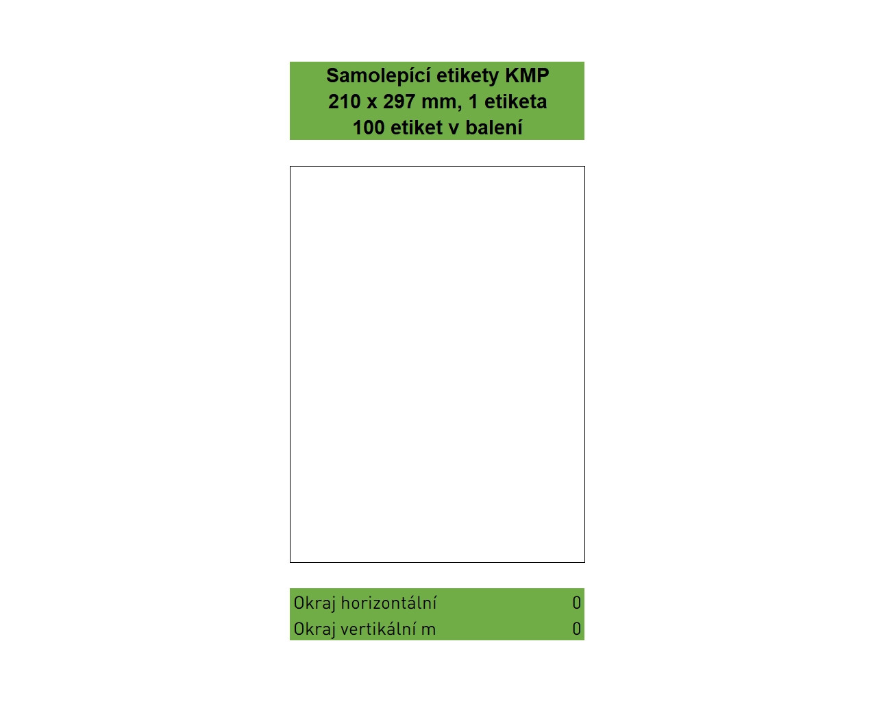 Samolepící etikety KMP velikosti 210 x 297 mm, 1 etiketa na listu, 100 listů A4 v balení, 100 etiket. Svrchní bílý bezdřevý matný papír klasické gramáže 70g/m². Spodní strana permanentní akrylátové lepidlo. Etikety jsou na podkladovém papíru o gramáži 55 g/m². Etikety jsou určeny pro potisk ve všech běžných typech laserových a inkoustových tiskáren.