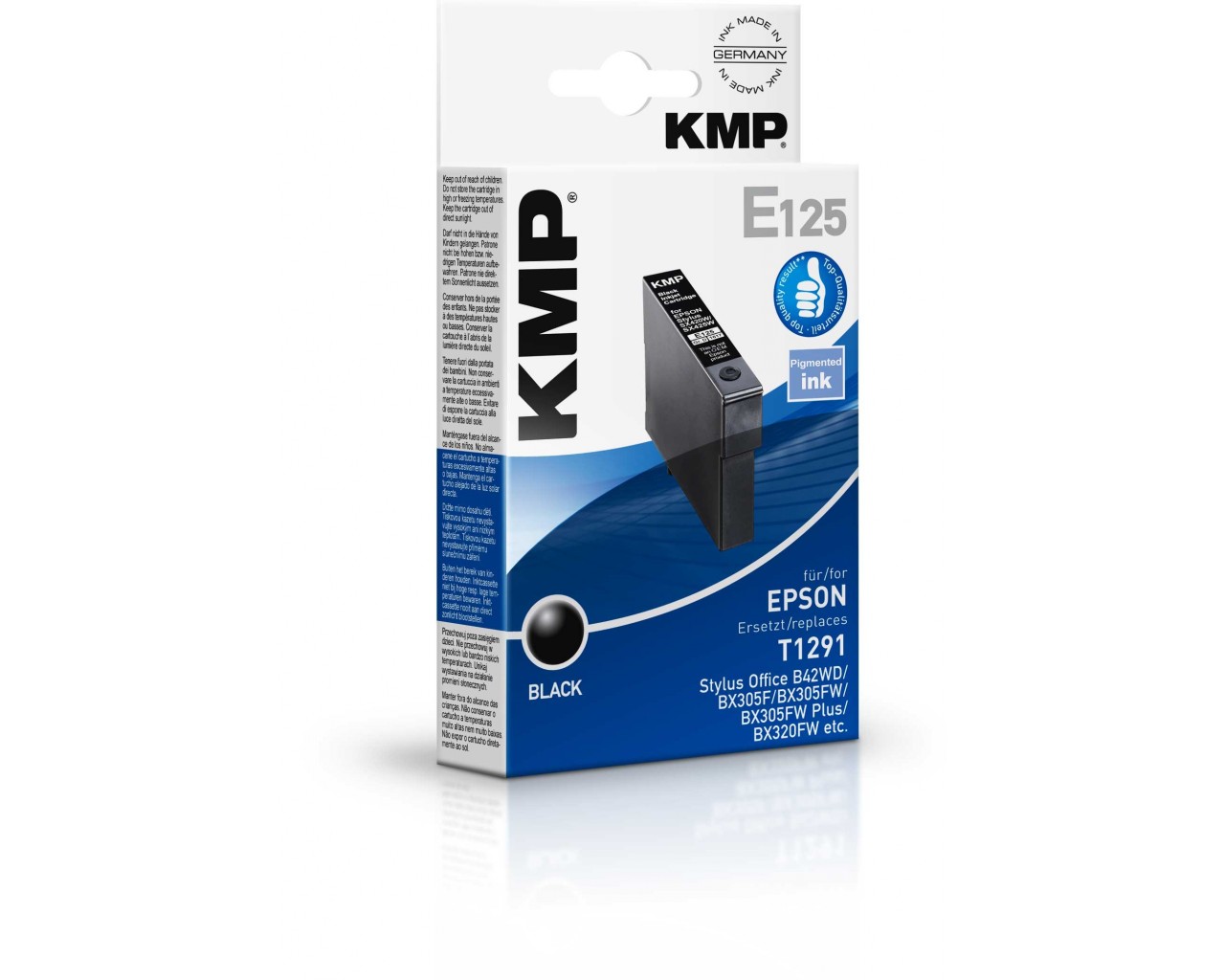 Náplně byly testovány v časopise Stiftung Warentest (www.test.de - vydání 10/2012). Výsledné hodnocení náplně KMP: dobrý (2,2) - žádný z konkurentů se tolik nepřiblížil originálu jako cartridge KMP. V odolnosti proti setření, odolnosti proti vodě a odolnosti prosti světlu si cartridge KMP vedly velmi dobře a velmi dobře byla hodnocena tisková kvalita textu, grafiky i fotografií. Testovány byly také časopisem Computer-Magazin c't (vydání 11/2012) - „Nejlepší kvalitu inkoustu dodává společnost KMP. Je rovnocenný originálu a přináší ještě trochu lepší barevné snímky než inkoust Epson". Kompatibiní s originální inkoustovou cartridgí Epson s jablkem na obalu.